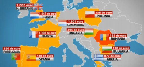 Bulgarii se clasează pe ultimul loc, cu un salariu de 138 de euro pe lună. Cel mai mare salariu minim din Europa îl au angajaţii din Luxemburg, respectiv de 1.801 euro, adică de 11 ori mai mare decât cel din România.