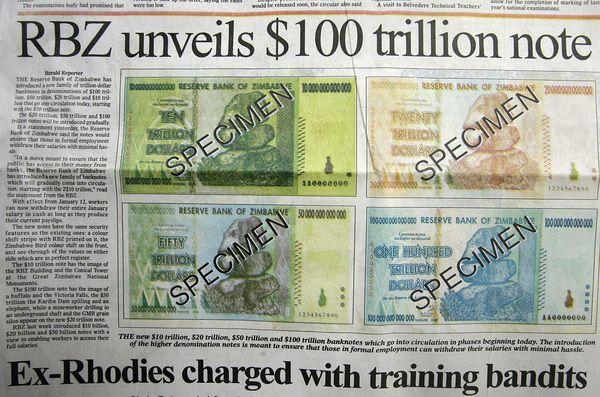 Însă nu s-a oprit totul aici. Un an mai târziu, în 2009, banca naţională a printat bancnota de 100 de trilioane de dolari de Zimbabwe.