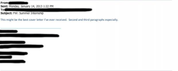 Îmi cer scuze pentru natura ciudată a scrisorii mele, dar este sinceră şi sper să vă gândiţi să mă luaţi sub aripa dvs. în această vară. Vă mulţumesc pentru timpul dvs".