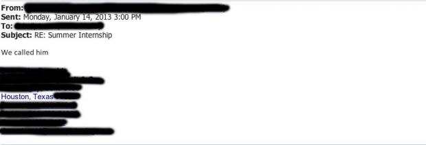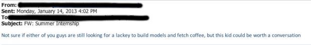 "Bună ziua. Sunt student şi v-am întâlnit vara trecută la Smith & Wolensky, în New York. Vă mulţumesc că în acea seară v-aţi luat timp să staţi de vorbă cu mine. Vă scriu pentru că mă interesează să fac practică în biroul dvs. pe timpul verii. Realizez că este puţin neobişnuit să primiţi studenţi care încă nu au terminat studiile, şi care vin de la Universităţi obişnuite, însă m-am gândit că aţi putea face o excepţie.