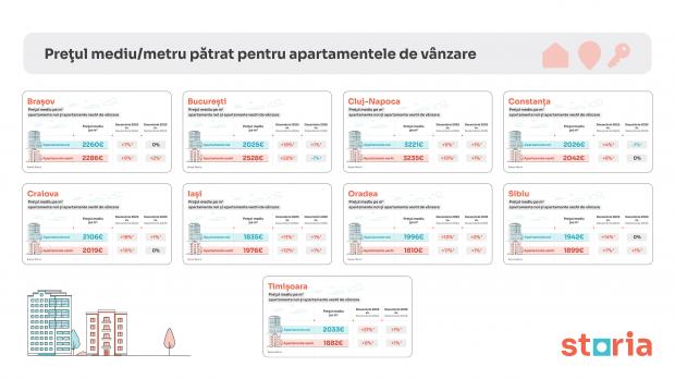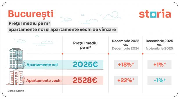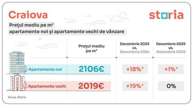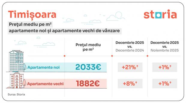 Potrivit analizei Storia, Timișoara a înregistrat cea mai mare creștere de prețuri pentru apartamentele noi. În orașul din vestul României, dezvoltatorii imobiliari au solicitat în decembrie 2025 în medie 2.033 euro/mp, cu 21% mai mult comparativ cu decembrie 2024.