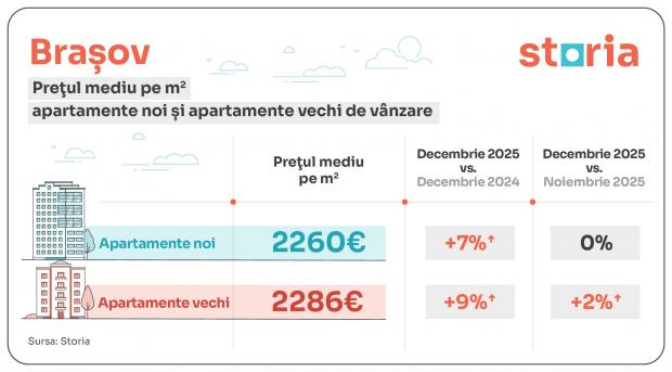 Brașov este unul dintre cele numai trei orașe în care diferențele de preț între apartamentele vechi și noi sunt practic neglijabile, chiar dacă prețurile la locuințele vechi au crescut într-un ritm ușor mai alert (+9%) comparativ cu locuințele noi (+7%), potrivit analizei Storia.