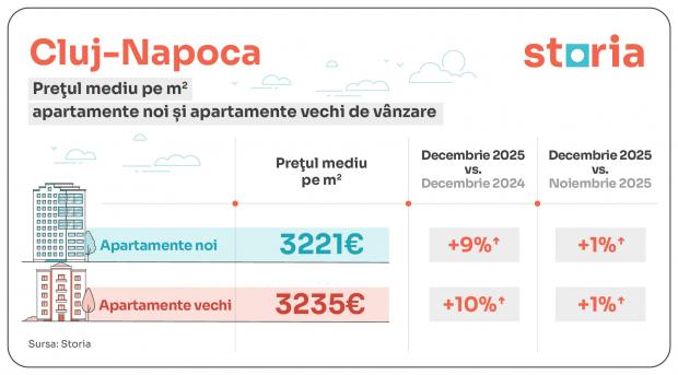 Cele mai scumpe apartamente sunt în continuare în Cluj-Napoca, unde metrul pătrat depășește 3.200 de euro. La distanță semnificativă se află București, în ciuda scumpirilor prețurilor locuințelor cu aproape 20%, urmat de Craiova și Timișoara. La polul opus se află Iași și Sibiu, unde metrul pătrat se vinde cu aproximativ 1.900 de euro. Anul trecut, apartamentele vechi au devenit mai accesibile decât cele noi, potrivit unei analize realizate de Storia. Potrivit analiștilor, nu există indicii că prețurile apartamentelor vor scădea în 2026, iar cererea rămâne constantă, deși cumpărătorii vor fi mai exigenți în alegerile lor.