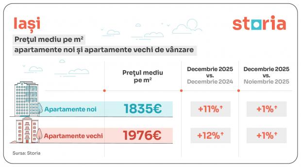 Cele mai accesibile prețuri la apartamentele noi sunt în Iași. Dezvoltatorii imobiliari au solicitat în decembrie 2025 un preț mediu de 1.835 euro/mp. În schimb, proprietarii au solicitat în medie 1.976 euro/mp pentru apartamentele vechi.
