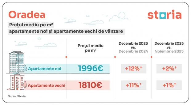 Oradea a înregistrat în decembrie 2025 a patra cea mai mare creștere procentuală a prețului pe parcursul anului 2025 (+11%), însă chiar și în acest context rămâne printre orașele cu cele mai mici prețuri medii de vânzare din țară, cu un preț mediu cumulat de 1.851 euro/mp.