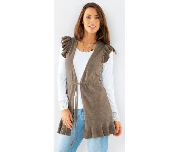 Forma lunga moderna, stil empire cu snur sub bust. Fara maneca. Cu volan rafinat la tiv si rascroiala manecii. Decolteu in V. Lungime de la 80 pana la 84 cm, in functie de marime. Lavabila. Material: 50% bumbac, 50% poliacril.