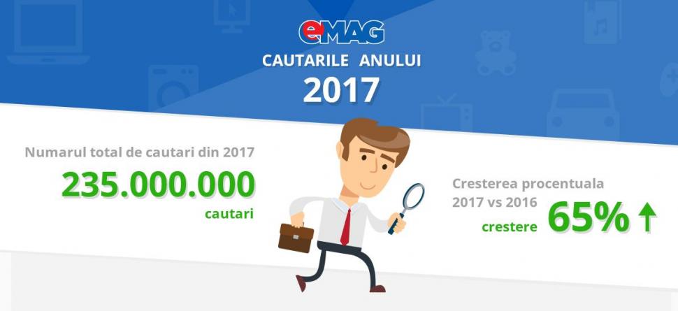 Numărul căutărilor pe eMAG a crescut cu 65% în 2017, comparativ cu anul trecut și a ajuns la 235.000.000. Cuvântul care a înregistrat cea mai mare creștere a numărului de căutări a fost kendama.