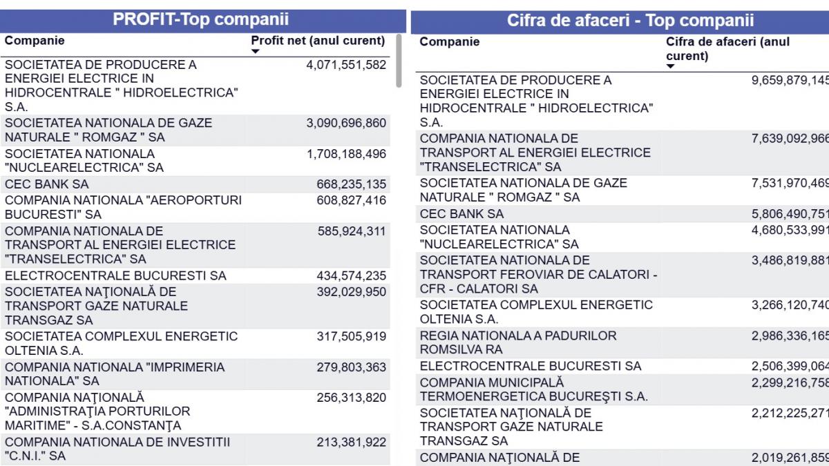 Cele mai profitabile companii din 2024 sunt Hidroelectrica (4 miliarde lei), Romgaz (3,09 miliarde lei), Nuclearelectrica (1,7 miliarde lei), CEC Bank (668 milioane lei) și Compania Națională Aeroporturi București (609 milioane lei).
