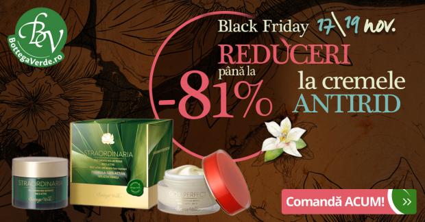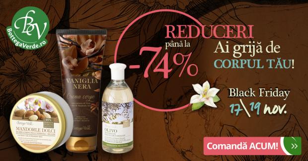 Dacă eşti mare amator de cumpărături online, cea mai importantă zi din calendarul de anul acesta este 17 noiembrie, adică Black Friday România 2017. În week-end-ul 17-19 noiembrie, Bottega Verde, brandul de cosmetice numărul 1 în Italia, te aşteaptă cu reduceri de până la 82% la toate produsele. Pregătește din timp cadourile pentru cei dragi şi comanda produsele dorite.