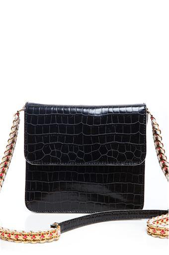 Completează un outfit elegant cu o geantă croco de culoare neagră, semnată de Stella McCartney.