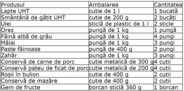 Mai exact, pachetele cu alimente vor conține: lapte, smântână, ulei, orez, făină, mălai, paste făinoase, zahăr, conserve de carne şi legume, bulion şi gem, potrivit avocatnet.ro.