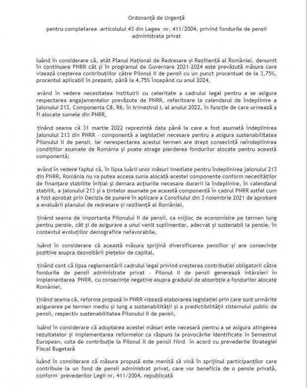 Prin actul normativ adoptat astăzi, se asigură respectarea calendarului stabilit prin PNRR (componenta C8, R6, jalon 213), contribuțiile la Pilonul II de pensii fiind în linie cu prevederile Strategiei Fiscal Bugetare", se arată în comunicatul de presă.