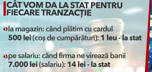 Spre exemplu, în cazul unei achiziții cu cardul de la un magazin, în valoare de 500 de lei, un leu se va duce la stat. De asemenea, aceeași regulă s-ar aplica și în cazul salariului, când firmele virează banii. Dacă o persoană are salariul de 7.000 de lei, 14 lei se vor duce tot către stat.