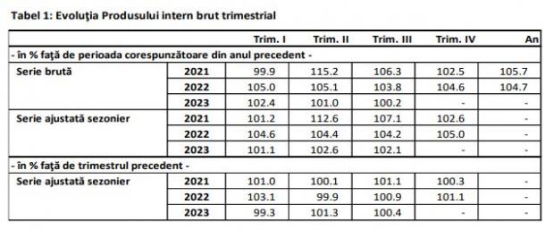 Institutul Național de Statistică (INSSE) a calculat că, faţă de acelaşi trimestru din anul 2022, PIB-ul României a înregistrat o creștere de +0,2 % pe seria brută şi de +2,1% pe seria ajustată sezonier, care ține cont de numărul zilelor lucrătoare.