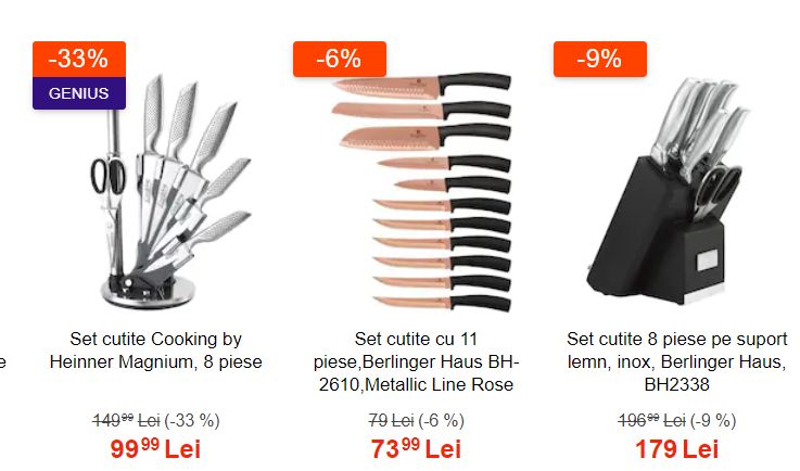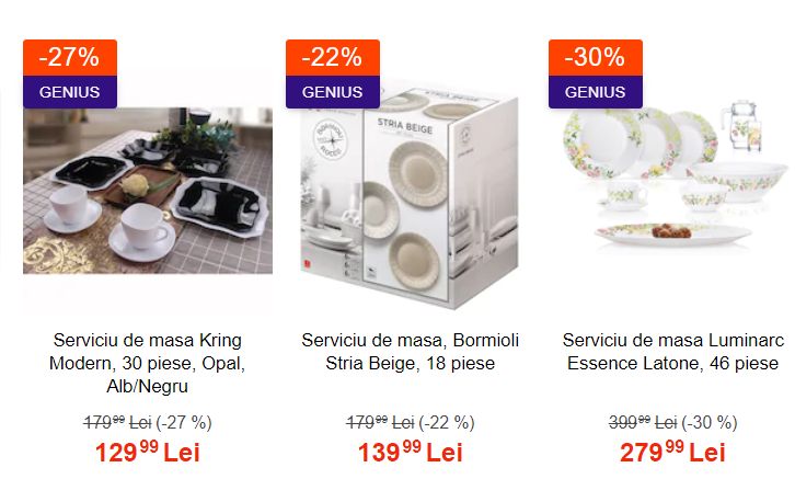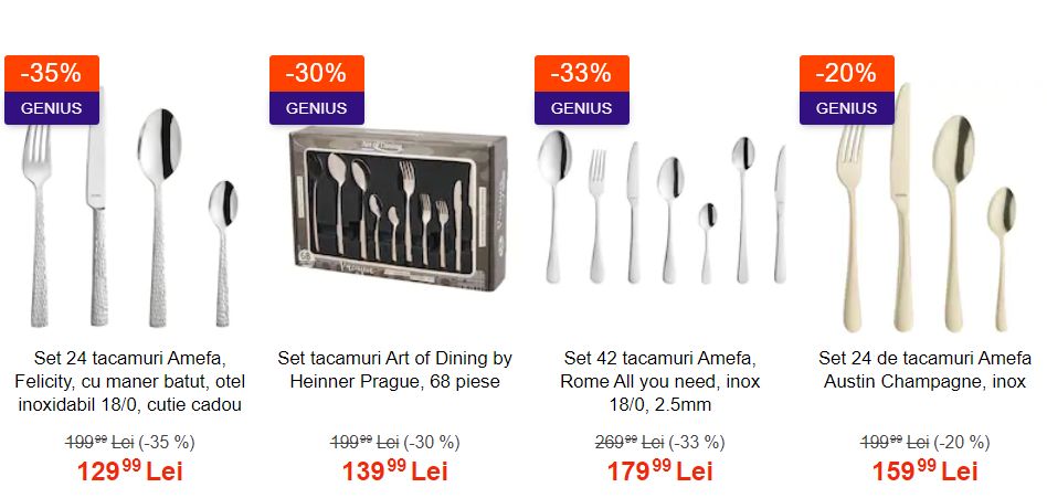 Din fericire, eMAG are reduceri foarte mari la seturi de oale, tigai, gratare, cutite, servicii de masa, farfurii, tacamuri si alte produse, astfel incat va fi foarte usor sa gatesti preparatele tale preferate si sa te bucuri de ele in propria locuinta.