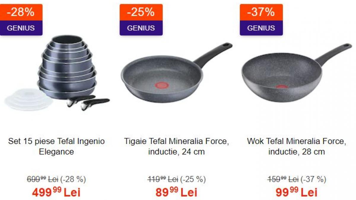 1. Un set din 15 piese de la Tefal Ingenio Elegance beneficiaza de o reducere de 28% si costa 499,99 lei.