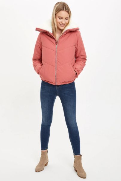 1. Geaca cu captuseala de blana shearling sintetica, Rosu stins, de la DeFacto.