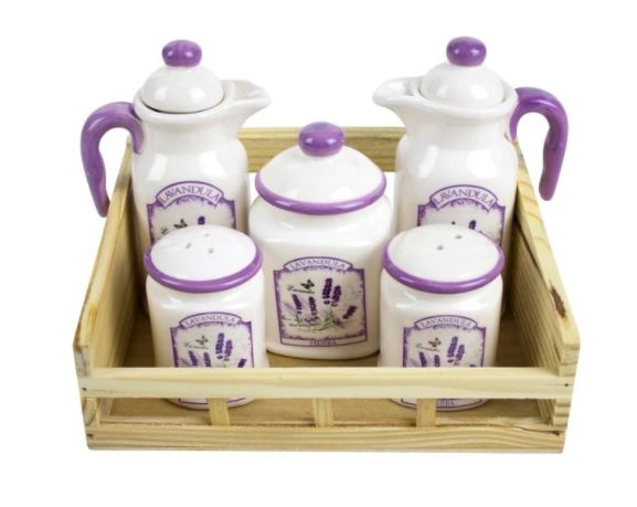 7. Set condimente 5 piese pe suport de lemn LAVANDA. Setul pentru condimente este fabricat din portelan si lemn.