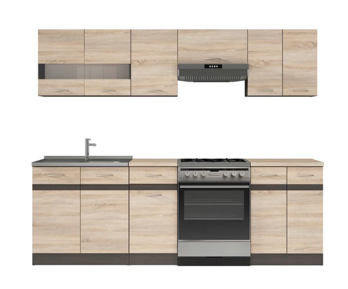 Bucataria Kring Yasmine contribuie la amenajarea eficienta si moderna a bucatariei tale ai iti permite sa pastrezi un stil aerisit, avand o lungime de doar 240 cm. Bucataria este dotata cu multiple spatii de depozitare, toate inchise cu usi din lemn pentru a mentine un aspect curat si ordonat. Fiind confectionata din PAL, un material tratat chimic, este rezistenta la umezeala si are un pret accessibil. Combinatia cromatica contrastanta, sonoma deschis si sonoma inchis, faciliteaza integrarea acestui mobilier in orice tip de decor.