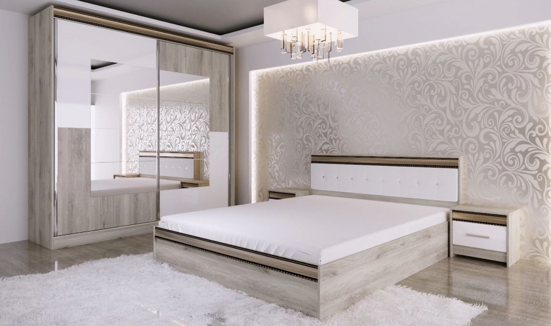 Dormitor stilat cu elemente de decor suplimentare, in combinatie de 2 culori. Material PAL 16 mm, PVC, PU.