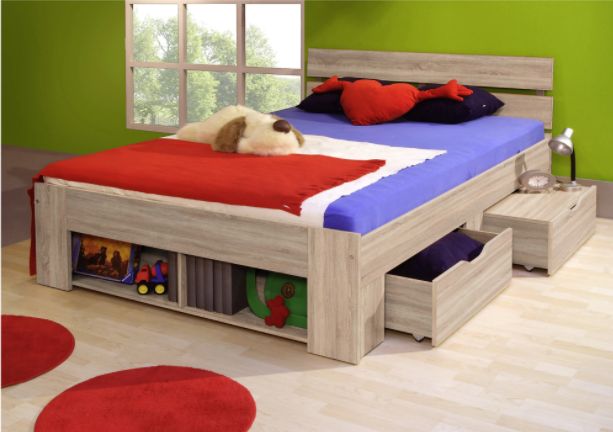 Pat camera tineret construit pentru a fi functional si practic, avand 2 sertare pe roti si doua spatii deschise de depozitare.
