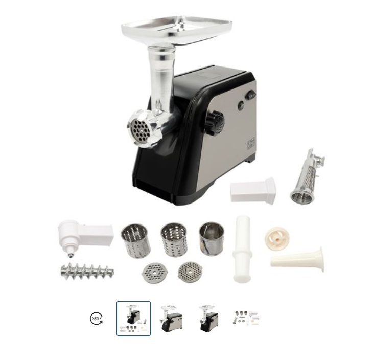 Datorita motorului puternic de 1800 W aceasta masina de tocat va asigura un ritm de tocare constant, fara a se bloca. Functia “reverse” este utila in cazul in care vreti sa tocati bucati de carne cu tesut mai dur, care se pot prinde in cutitul tocatorului. Este dotata cu o gama larga de accesorii, cu ajutorul carora puteti realiza carnati, chiftele, sucuri de tomate.