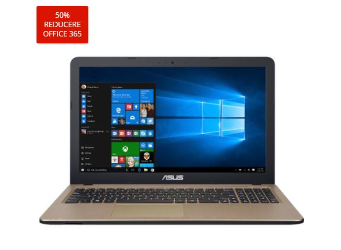 3. Laptopul ASUS A540MA-GO354T cu procesor Intel® Celeron® N4000 pana la 2.60 GHz, cu o diagonala foarte generoasa, de 15,6 inchi, 4GB, 500GB, Intel UHD Graphics 600, cu sistemul de operare Microsoft Windows 10 instalat, de culoare Chocolate Black, are o reducere de 20% in campania eMAG reduceri laptopuri.