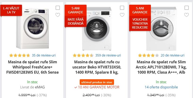 De asemenea, emag.ro scoate la vanzare masini de spalat la preturi bune ce au garantie de 5 ani (si chiar de 10 ani pentru motor).