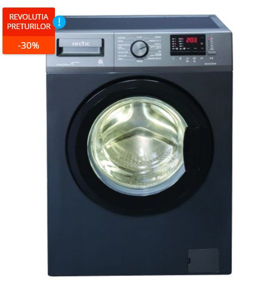 1. Masina de spalat rufe Arctic APL81222XLAB, cu o capacitate de incarcare de 8 kg, 1200 RPM, clasa A+++ de eficienta energetica, XL Door, antracit, are o reducere de 30% in campania eMAG reduceri electrocasnice Revolutia Preturilor.