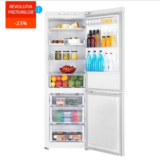 2. Combina frigorifica Samsung RB31HSR2DWW, cu un volum de 306 litri, sistem NoFrost, clasa A+ de eficienta energetica, inaltimea de 185 de cm, de culoare alba, are o reducere de 23% in campania eMAG reduceri electrocasnice Revolutia Preturilor.