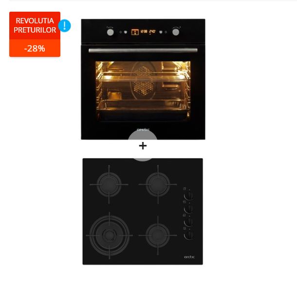 4. Un pachet alcatuit dintr-un cuptor incorporabil Arctic AROIM24500BC, electric, multifunctional, cu curatare catalitica, volum de 71 de litri, clasa A+ de eficienta energetica, de culoare neagra, si o plita incorporabila Arctic ARSGN64121SL, pe gaz, cu 4 arzatoare, Wok, aprindere electrica, din sticla neagra, beneficiaza de o reducere de 28% in campania eMAG reduceri electrocasnice Revolutia Preturilor.