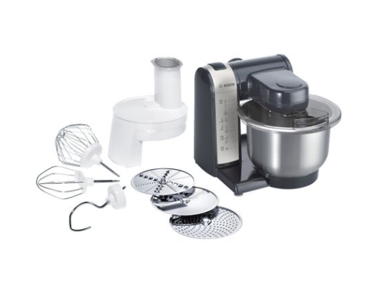 Acest robot de bucatarie are o putere de 550 de W si dispune de blender si de kitchen machine. De asemenea, are si rasnita. Capacitatea bolului este de 1,2 litri, iar a blenderului de 1,5 litri. Are discuri pentru feliere si disc pentru cartofi.