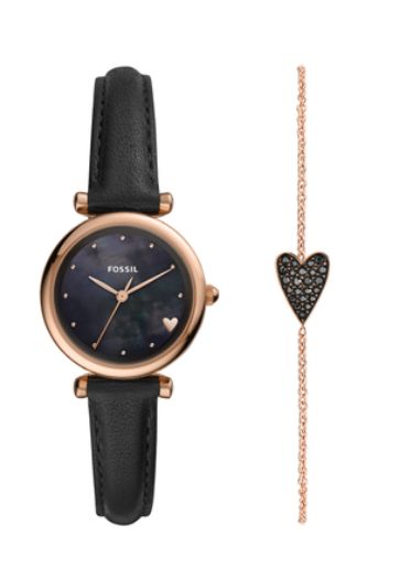 1. Un set de ceas cu o curea de piele si bratara Carlie de la Fossil, de culoare negru/auriu rose, are o reducere de 12% in campania eMAG reduceri de 8 Martie.