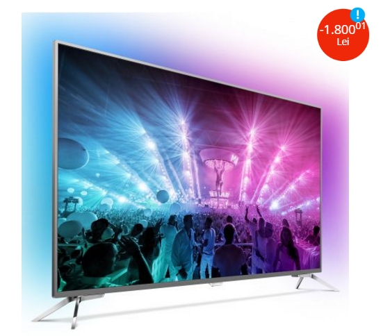 8. Televizorul LED Smart Android Philips, cu diagonala de 123 de cm, 49PUS7101/12, 4K Ultra HD, inclus in campania de reduceri eMAG televizoare, are o reducere de 1.800,01 lei. Ambilight este tehnologia unica Philips ce vine sa completeze un super Smart TV cu Android. Cu Ambilight pe 2,3 sau 4 laturi va veti bucura de cea mai buna experienta de vizionare, dar si de utilizare a aplicatiilor si jocurilor disponibile pe Android TV. In plus, puteti sa folositi smartphone-ul impreuna cu aplicatia Philips TV Remote pentru a controla televizorul chiar si atunci cand nu gasiti telecomanda. Pretul este AICI.
