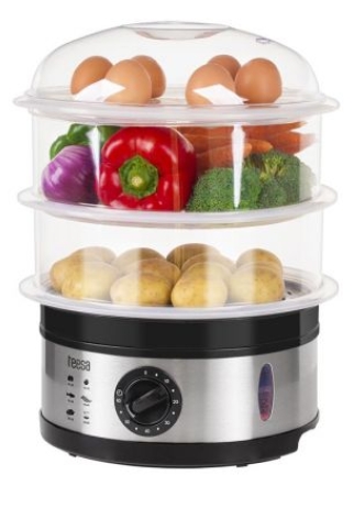 11. Un aparat de gatit cu aburi Teesa are o reducere de 65% pe siteul emag.ro. Aparatul are o capacitate de 3.3 / 6.6 / 8.4 litri pentru 1/2/3 rafturi. Are doua cosuri, un raft pentru oua, indicator nivel apa, indicator alimentare retea si intrerupere automata cu alarma. Pretul este AICI.