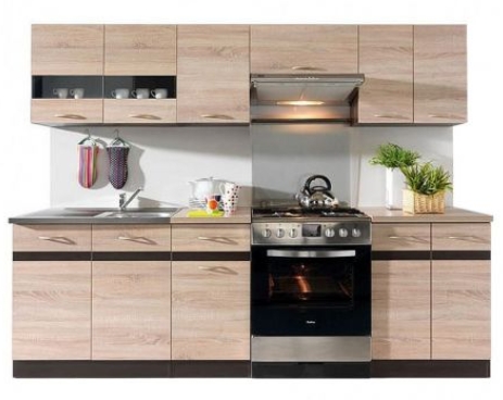 Mobilierul are dimensiunea de 240 cm si cuprinde sapte module care pot fi dispuse independent: patru corpuri superioare si trei corpuri inferioare. Setul include o selectie de corpuri pentru dotarea practica a spatiului de gatit: vitrina, dulapuri inferioare si superioare, masca de chiuveta.