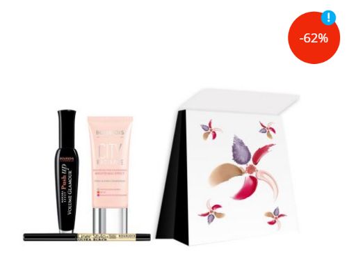 De exemplu, un pachet Promo Bourjois: Mascara Bourjois Volume Glamour Push Up 71 Black, 7 ml + Creion pleoape Bourjois Stylo 61 Ultra Black, 0.28 g + Fond de ten Bourjois City Radiance 03 Beige Clair, are o reducere de 62% și costă 58,99 lei.