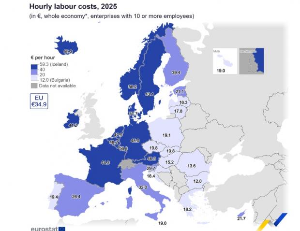 În 2025, costurile orare medii ale forței de muncă în întreaga economie au fost estimate la 34,9 euro în UE și 38,2 euro, în zona euro, în creștere față de 33,5 euro și, respectiv, 36,8 euro în 2024.