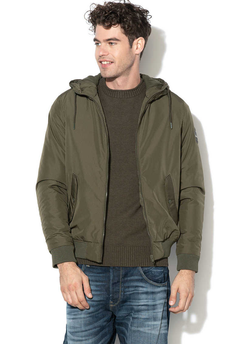 Jacheta este de culoare verde oliv, in stil casual, din material sintetic. Are gluga, maneci lungi, 2 buzunare cu capsa si unul interior cu fermoar. Gluga are snur pentru ajustare. Inchiderea se face cu fermoar.