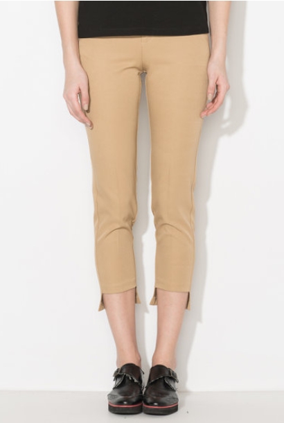 Perechea de pantaloni de culoare bej, in stilul casual, office, regular fit, cu terminatie asimetrica, are o inchidere cu nasture, fermoar, tija si anou.
