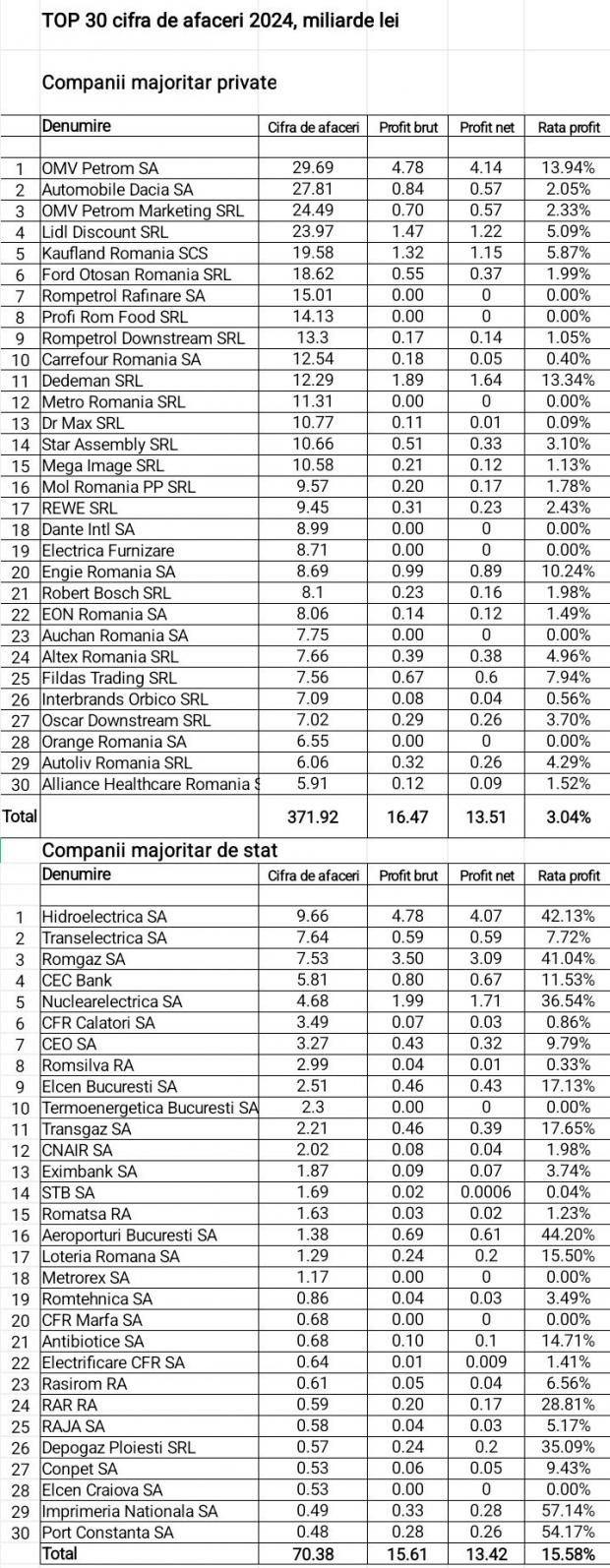 „Se vorbește mult despre performanța companiilor cu capital de stat versus cele private. Am analizat împreună cu un coleg rezultatele financiare ale primelor 30 de companii, după cifra de afaceri din 2024, din fiecare categorie și concluziile sunt interesante: Rezultatele analizei:
