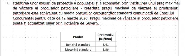 - Stabilirea unor măsuri de protecție a populației și a economiei prin instituirea unui preț maximal de vânzare al produselor petroliere - referinta prețul maximal de vânzare al produselor petroliere este echivalent cu media prețurilor carburanților standard comunicată de Consiliul Concurenței pentru data de 12 martie 2026