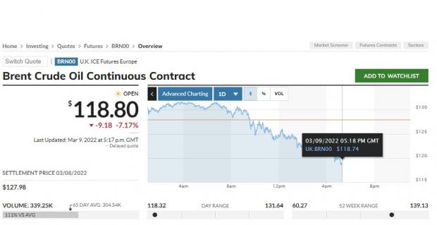 Conform MarketWatch, la ora publicării acestei știri, cotația țițeiului Brent coborâse la 118,8 dolari pe baril, ceea ce în termeni nominali înseamnă o pierdere de peste 9 dolari / baril sau o depreciere la nivelul zilei de peste 7% (captura următoare).