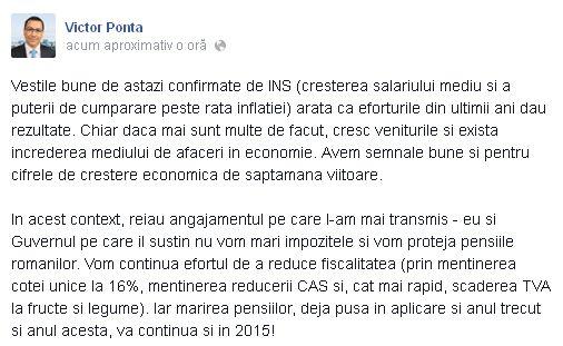 "Veştile bune de astăzi confirmate de (INS) Institutul Naţional de Statistică(creşterea salariului mediu şi a puterii de cumpărare peste rata inflaţiei) arată că eforturile din ultimii ani dau rezultate. Chiar dacă mai sunt multe de făcut, cresc veniturile şi există încrederea mediului de afaceri în economie. Avem semnale bune şi pentru cifrele de creştere economică de săptămâna viitoare", a postat premierul pe contul său de Facebook.