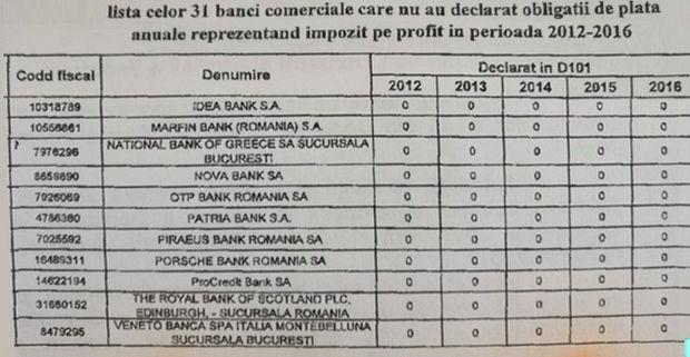 Documentul conține o listă cu 31 de bănci comerciale printre care se regăsesc nume sonore, care nu au declarat obligații de plată anuale reprezentând impozit pe profit în perioada 2012-2016.