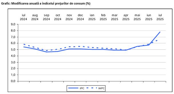 Rata anuală a inflaţiei în luna iulie 2025 comparativ cu luna iulie 2024 a fost 7,8%, potrivit Institutului Național de Statistică.