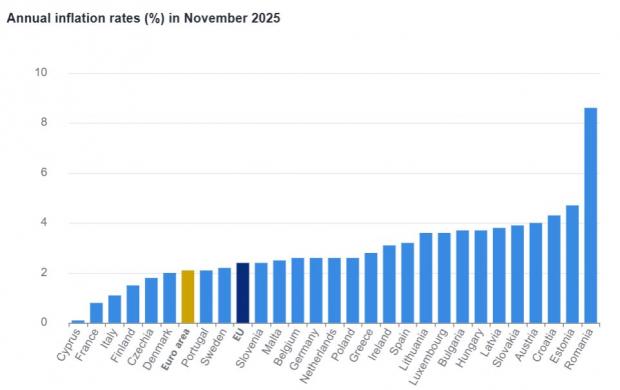 Cele mai mici rate anuale au fost înregistrate în noiembrie în Cipru (+0,1%), Franța (+0,8%) și Italia (+1,1%).