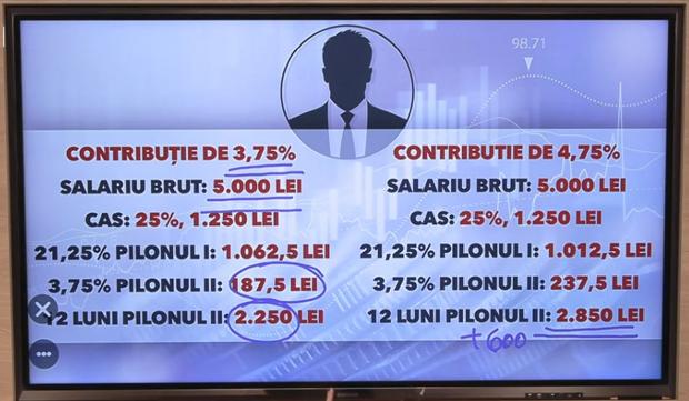 Cu noua contribuție, cea de 4,75%, într-un an se adună cu 600 de lei în plus la pilonul II, deci se ajunge la suma de 2.850 lei.