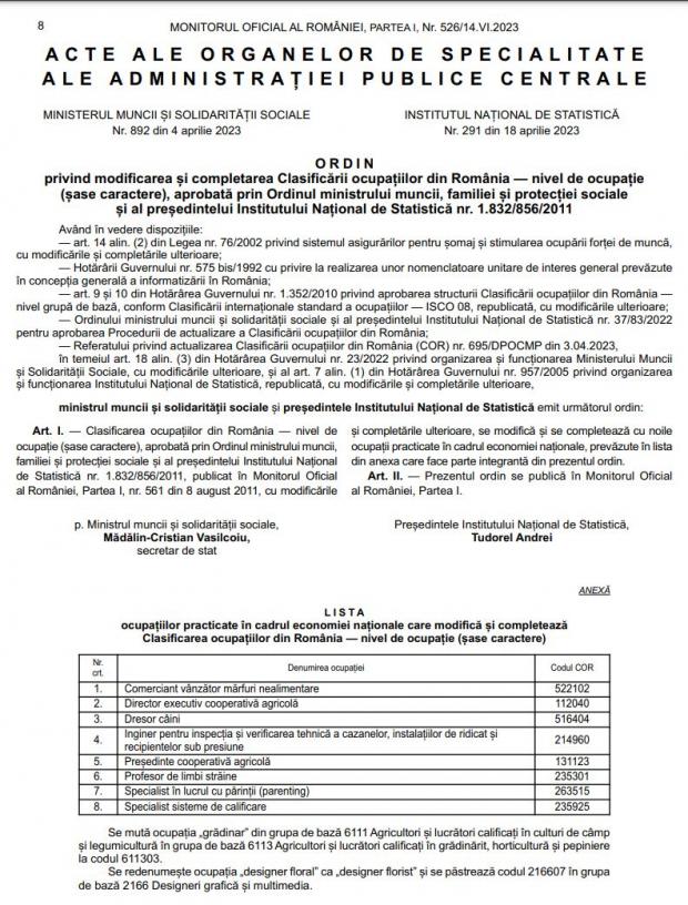 - se redenumeşte ocupaţia "designer floral" ca "designer florist" şi se păstrează codul 216607 în grupa de bază 2166 Designeri grafică şi multimedia, potrivit zf.ro.