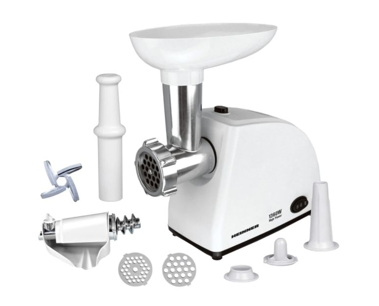 2. Masina de tocat Heinner MG-W1200R, 1360W, Accesoriu rosii, Accesoriu carnati, Cutit inox, Alb.